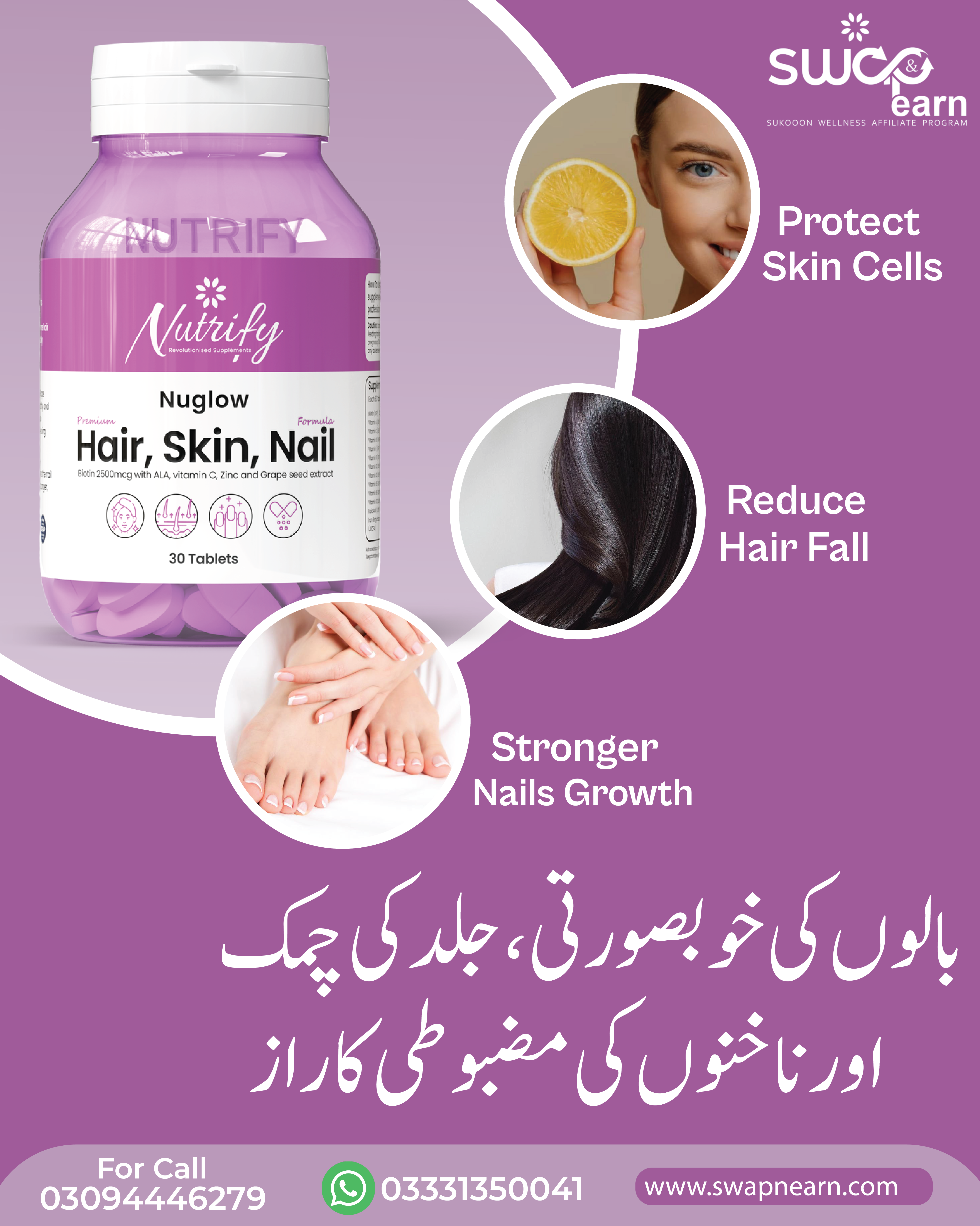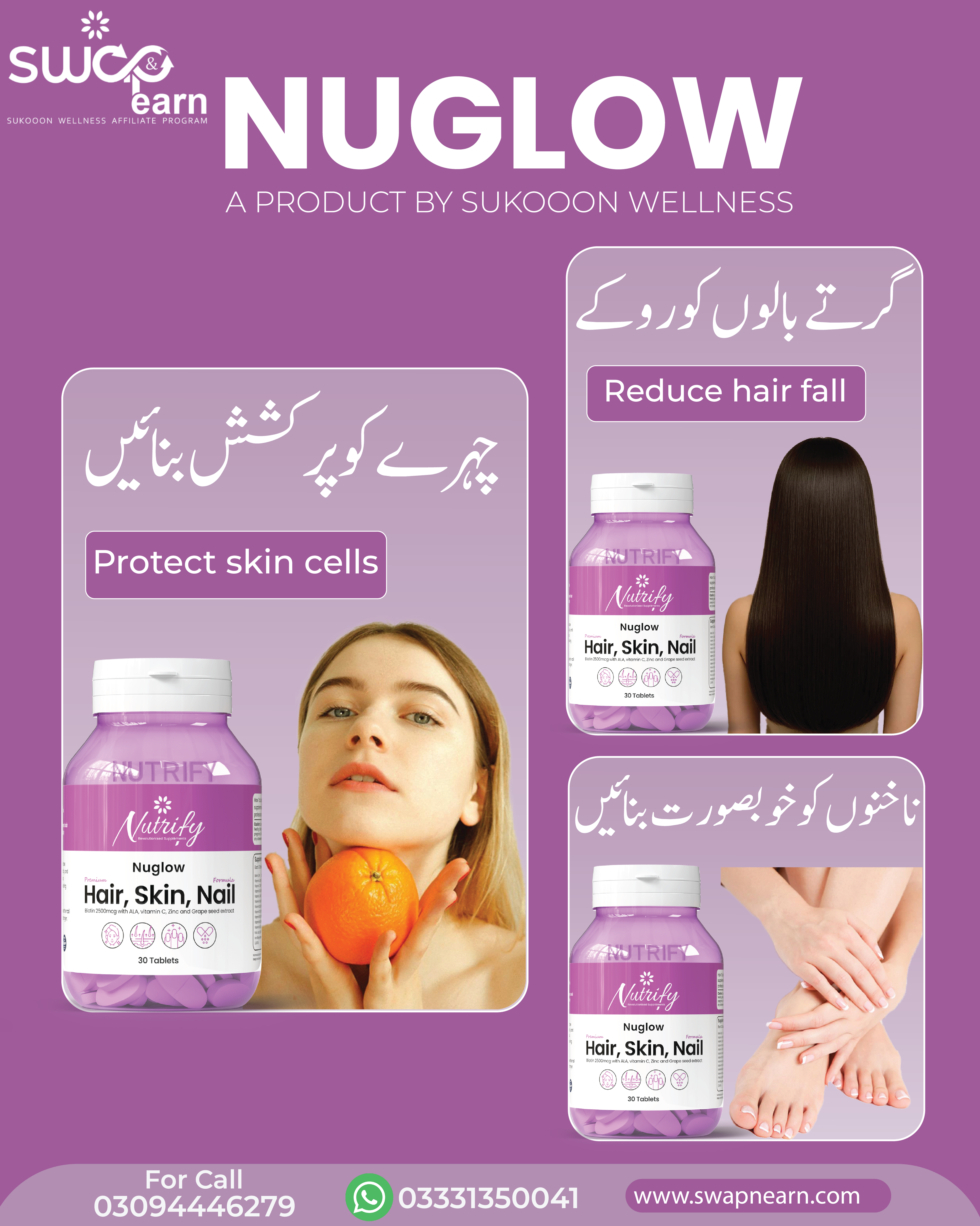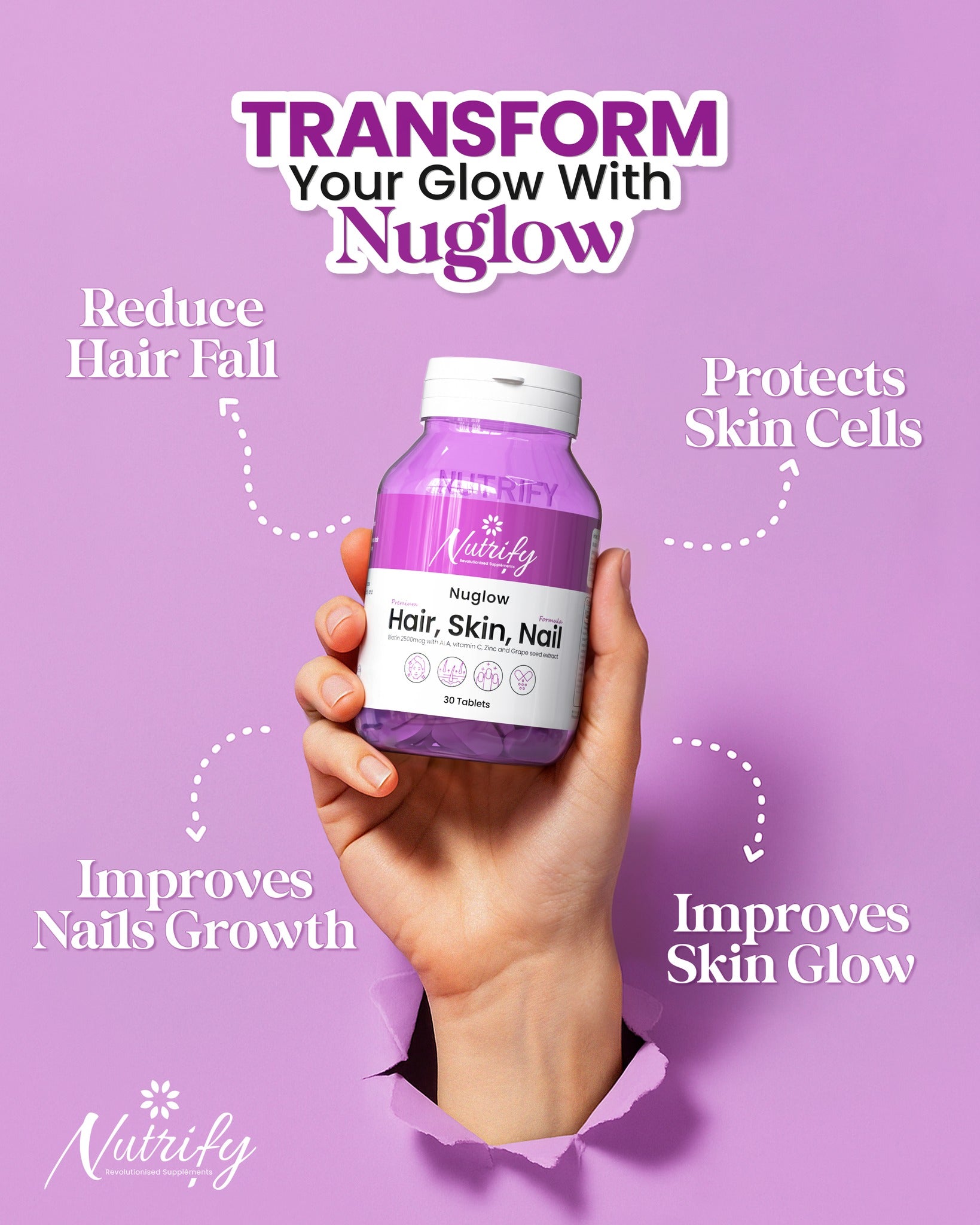 Nuglow by Nutrify is a premium Hair, Skin & Nail supplement designed to bring out your natural glow from within. Packed with Biotin (2500mcg), Vitamin C, ALA, Zinc, Grape Seed Extract, and other essential nutrients, Nuglow works to promote hair growth, enhance skin glow, and strengthen nails — helping you look and feel your best every day.