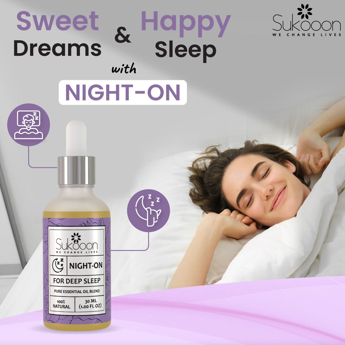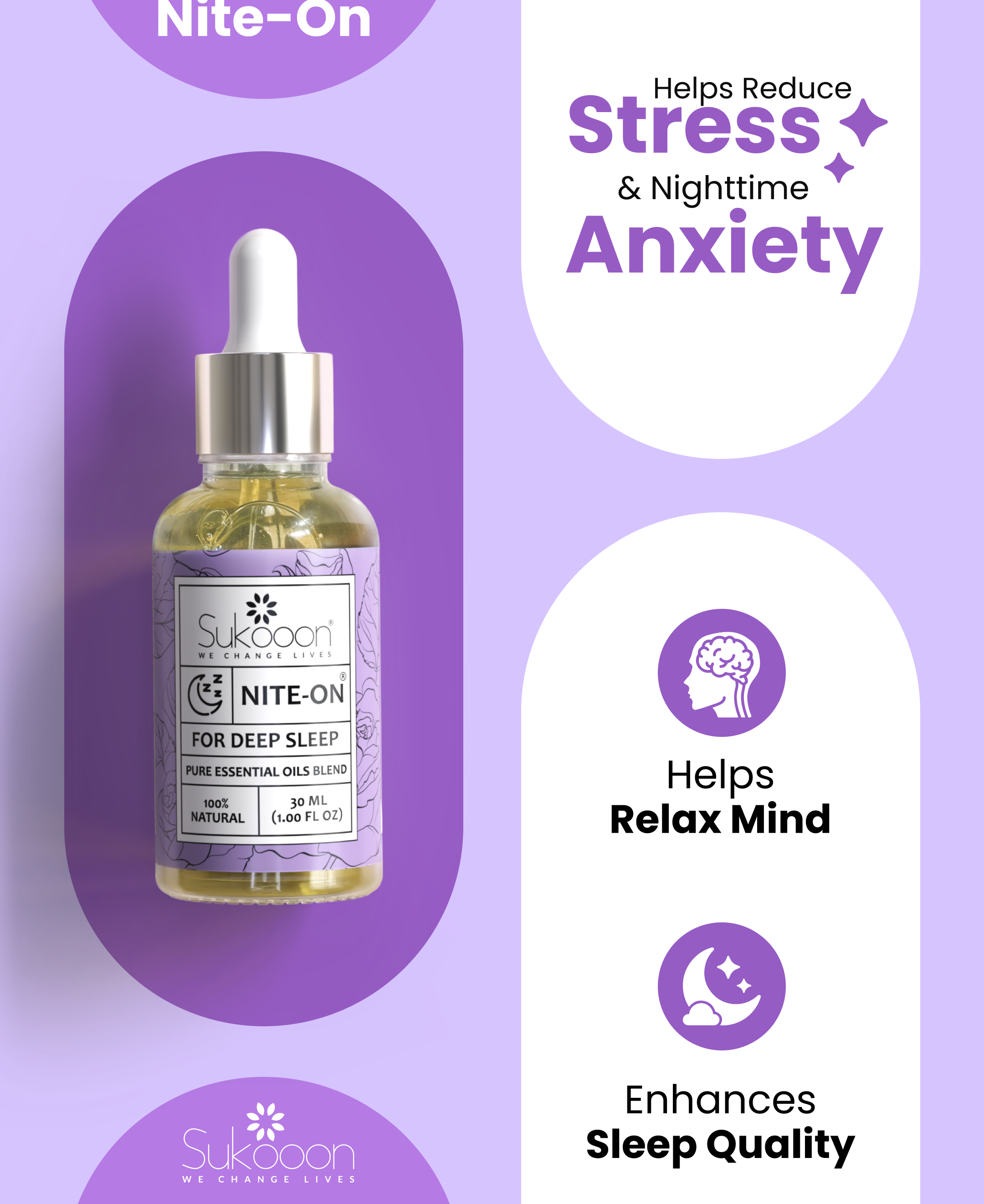 Apply 3-4 drops of Night-on essential oil blend at temples, back of neck and wrists and gently massage until fully absorbed. Apply one hour before the desired sleeping hour. Use twice or thrice a day as per need.